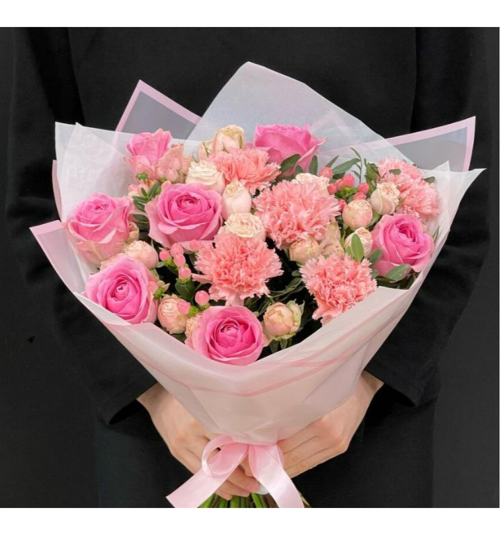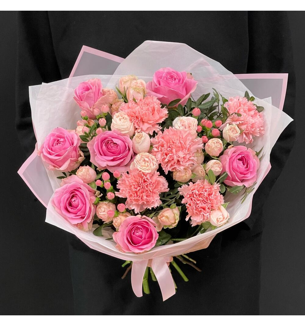 Розовый букет, великолепно составленный из прекрасных цветов: гиперикум, розы, гвоздики и кустовые пионовидные розы. В нем также присутствуют изысканные веточки фисташки. Этот уникальный состав приносит нотки романтики и изящества, идеально подходит для выражения нежности и любви. Стильная дизайнерская упаковка завершает образ букета, делая его незабываемым подарком для особых моментов и радости вашим близким.