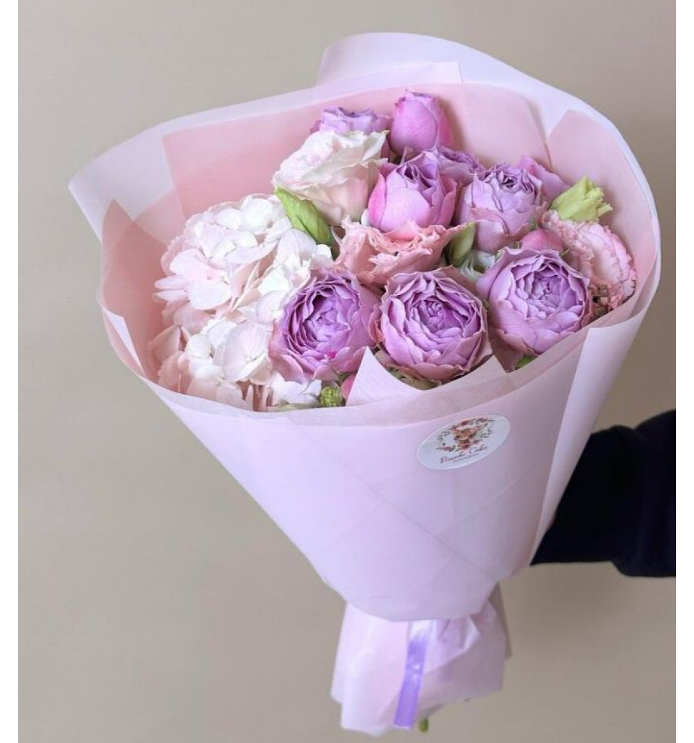 Авторский букет комплимент станет прекрасным подарком по поводу и без. Воздушная гортензия, махровая эустома и фиолетовая розочка покорят сердце и душу получателя