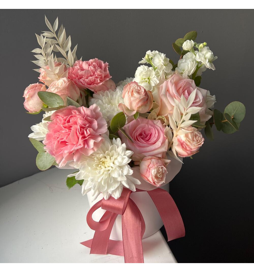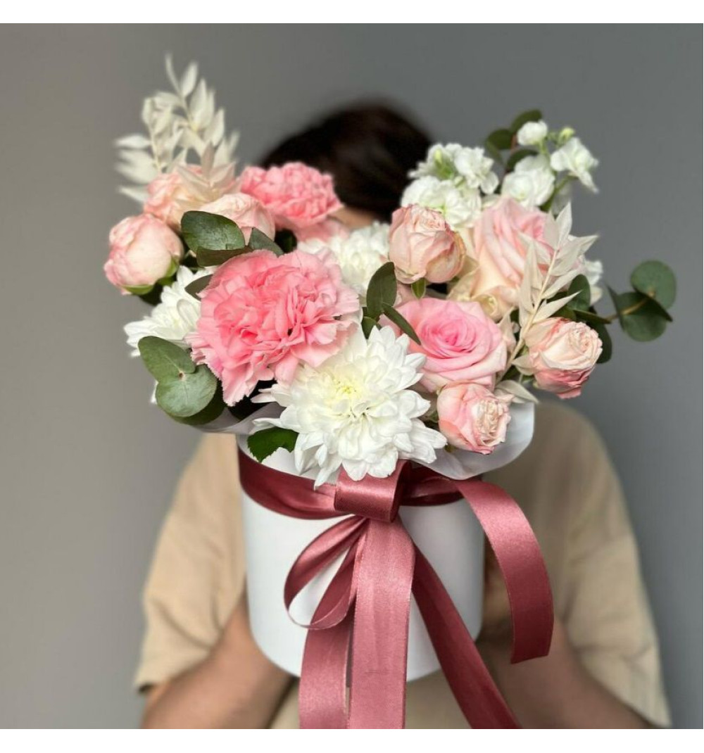 Купить Кустовые пионовидные розы, маттиола и хризантема в шляпной коробочке в Ушарале за 15 000 ₸ | интернет-магазин «Guls»