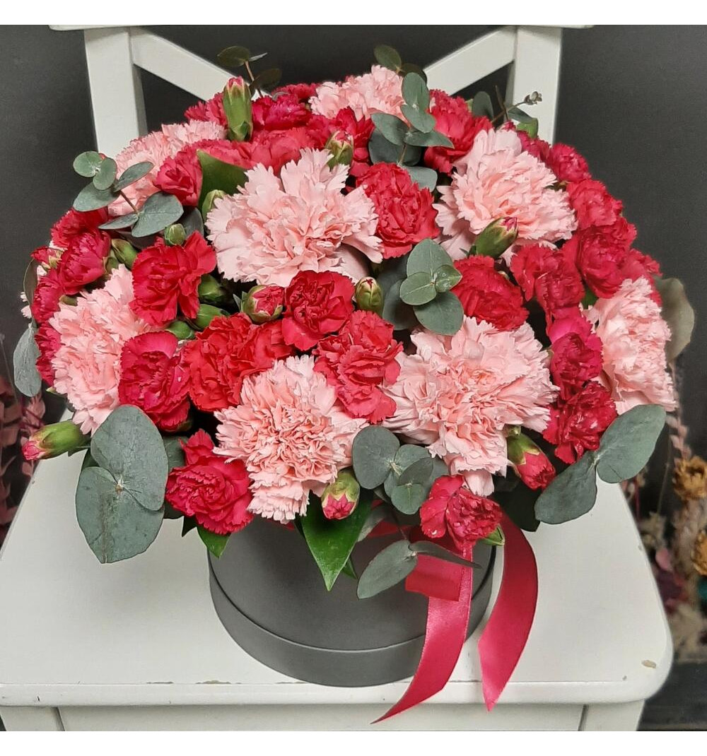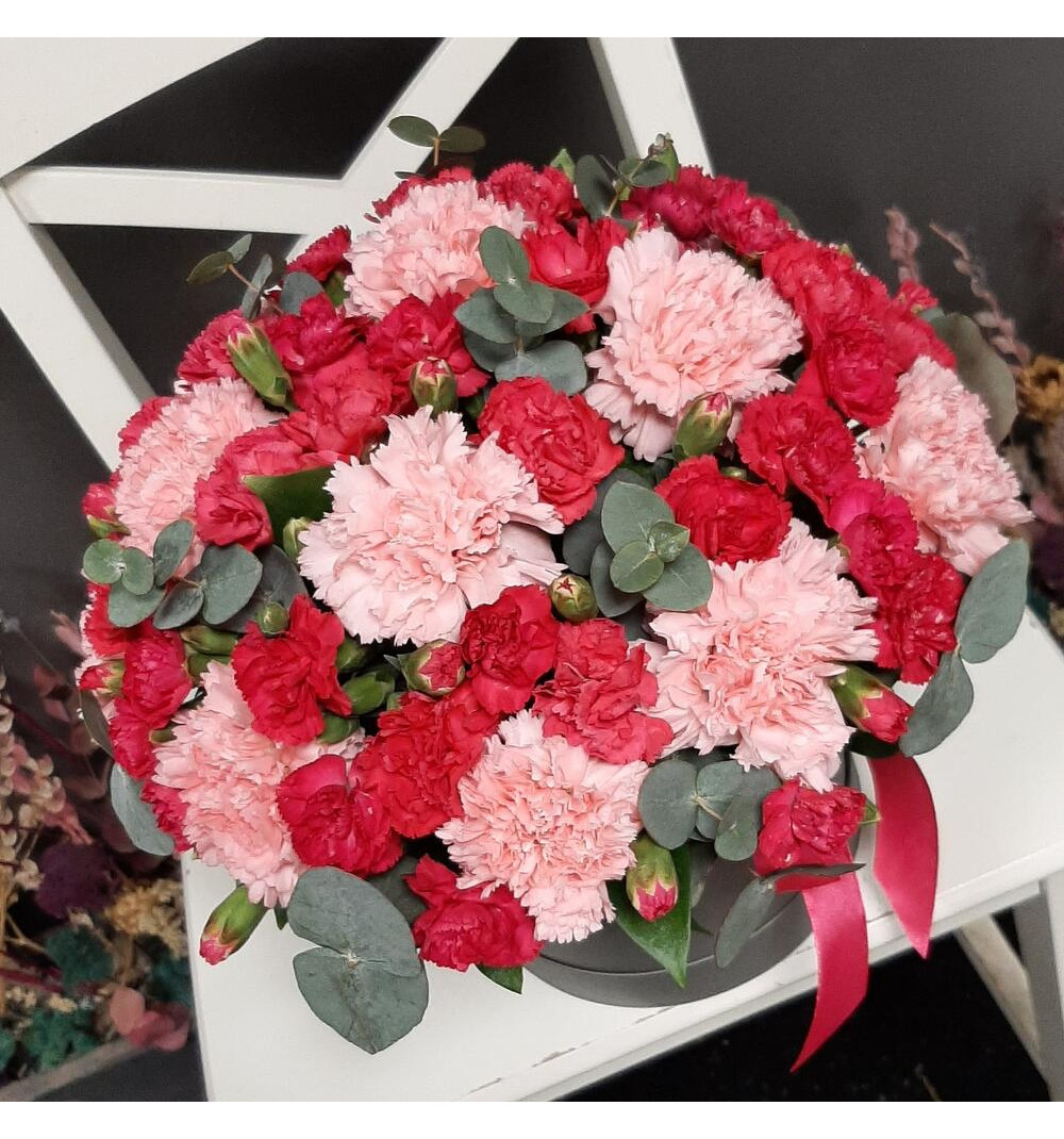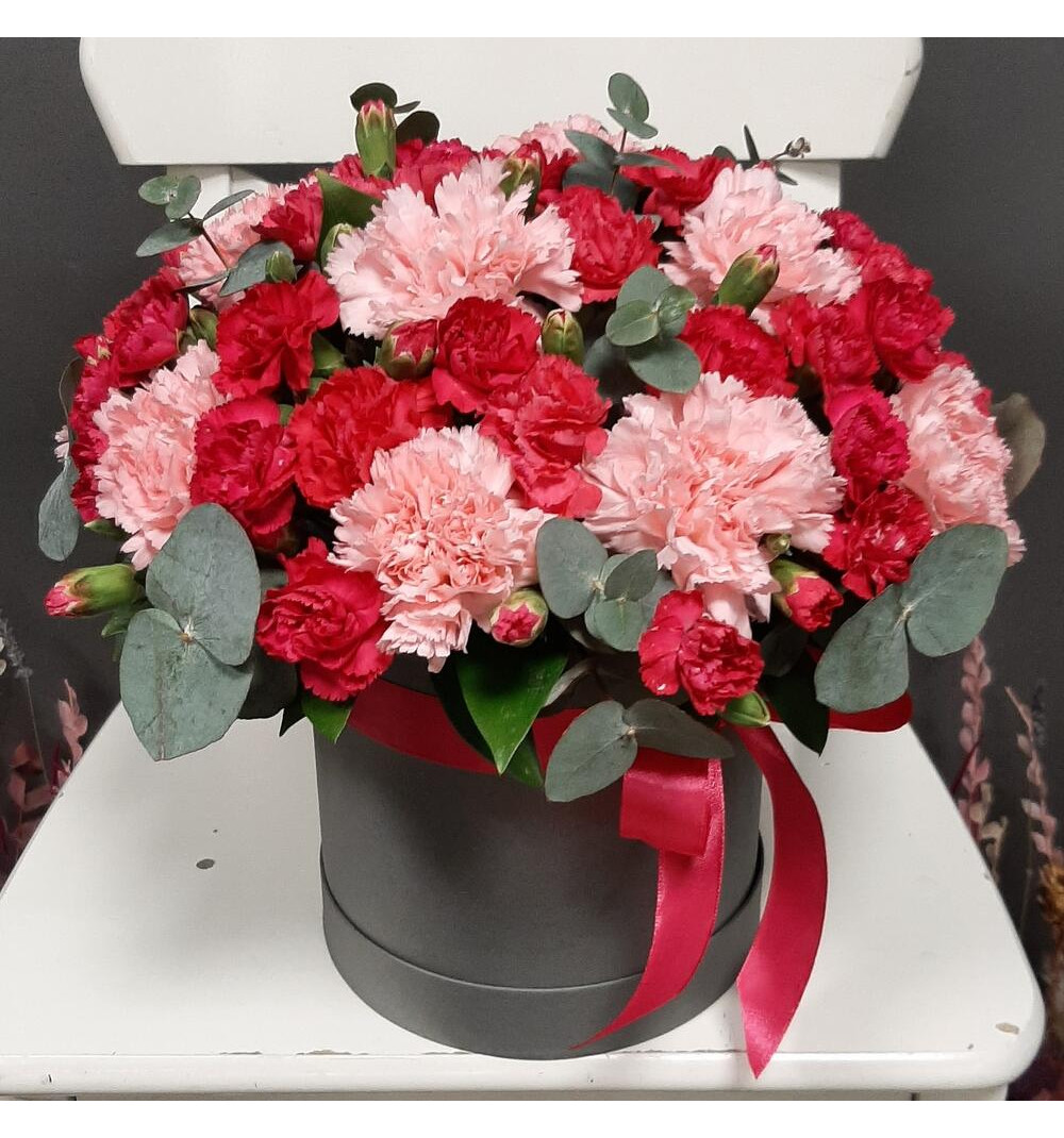Купить Яркая кустовая и нежно коралловая гвоздика в шляпной коробке в Ушарале за 25 000 ₸ | интернет-магазин «Guls»
